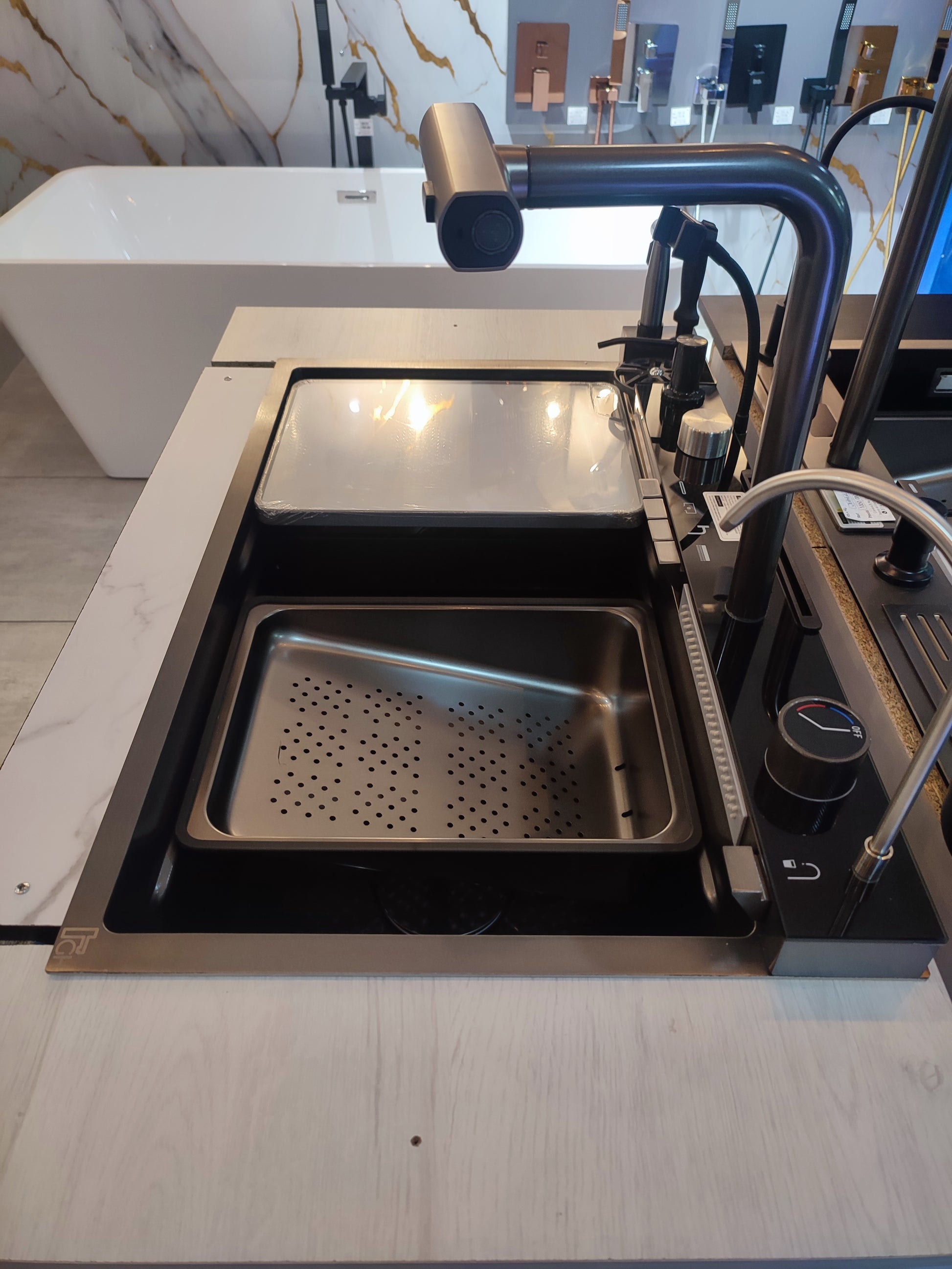 Incluye un grifo monocontrol extraíble con múltiples formas de salida de agua, permitiendo un manejo versátil y eficiente. Su diseño inteligente integra: